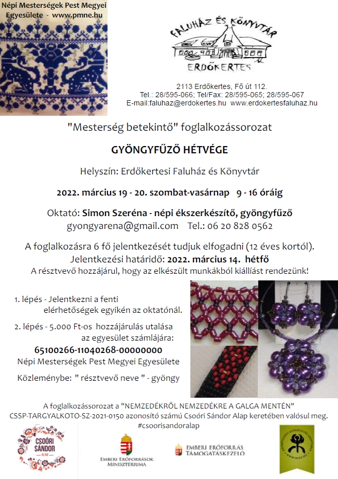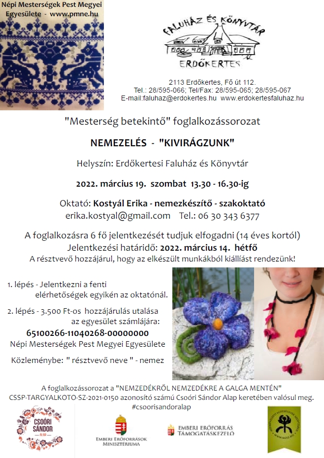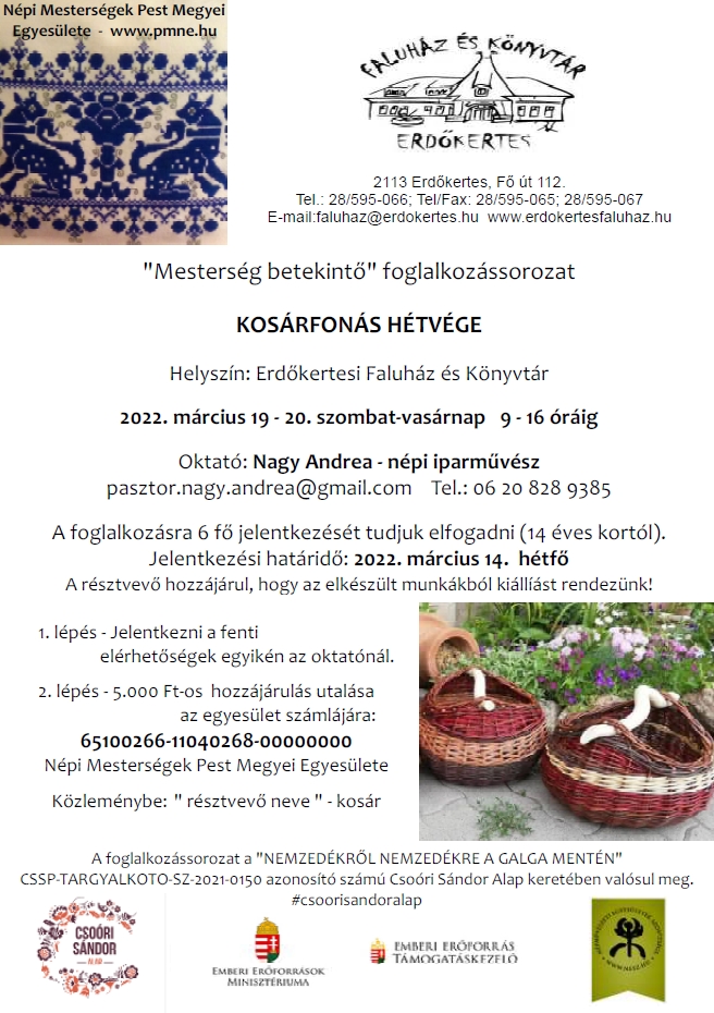 Március 19-én 10 órától Fecskehívogató Nap lesz Erdőkertesen, a Szent István Parkban. 19-én a Tarka Ürge Varázsművek kézműves foglalkozást biztosít a Faluházba ellátogató gyermekek számára: 9-12 óráig ovisoknak, iskolásoknak pedig 12.30-15 óráig, valamint 15-17 óra között. A Csoóri Sándor Alap jóvoltából, a Mesterségbetekintő foglalkozássorozat is folytatódik: 19-én 9-16 óráig a kosárfonást és a népi ékszerkészítést lehet majd elsajátítani, Nagy Andreával és Simon Szerénával, 13.30 és 16.30 között pedig a nemezelést Kostyál Erikával. Március 20-án vasárnap 9-16 óra között szintén lesz kosárfonás és népi ékszerkészítés, továbbá 26-án 13.30-16-30-ig nemezelés.
