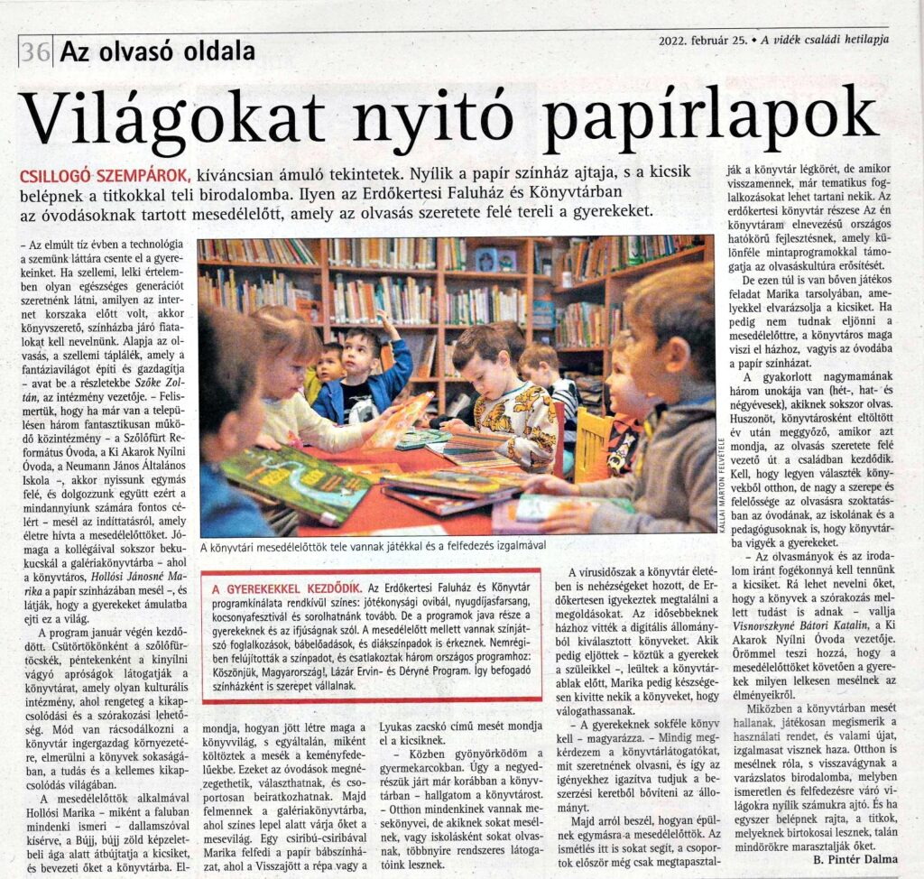 B. Pintér Dalma, a Szabad Föld újságírója Hollósi Marikával készített interjút a Könyvtári Mesedélelőtt foglalkozásokról. A cikk a hetilap 2022. február 25-i számában jelent meg, Az olvasó oldala rovatban.